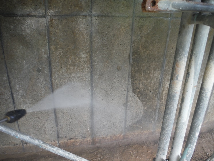 側壁部は、高圧洗浄で既設コンクリート表面の脆弱部を除去後、ポリマーセメントモルタルにて不陸整正を行いました。また、側壁コンクリートの水平打継部には、漏水を防止するためにガラスクロスをエポキシ樹脂にて貼付しました。