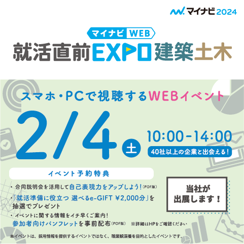 2023年2月4日(土)「マイナビ建築・土木系学生のための就活直前WEB EXPO」に出展いたします。
