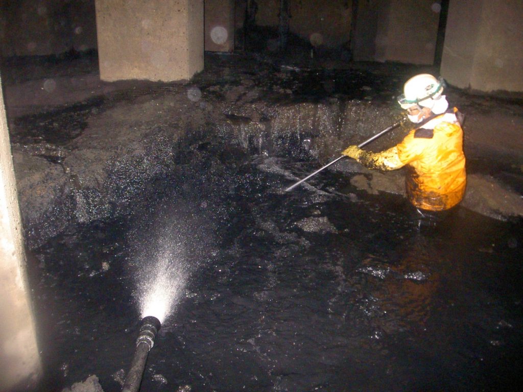 各部屋の汚泥処理・清掃作業完了後、ピット通路部に残った汚泥処理・清掃を行い、最終的にピットに残った汚泥は特殊強力吸引車(バキューム)で処理を行いました。