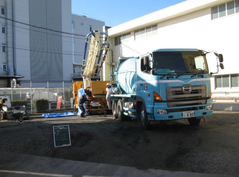 コンクリートを打設するにあたり、ポンプ場施設内部にミキサー車が入る事が不可能であるので、ポンプ場施設外部から配管を200m以上配置して打設を行う必要があり、いくつかの課題が発生しました。