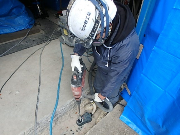 既設コンクリートの浮き等の脆弱部をハンマードリルにて斫り撤去しました。