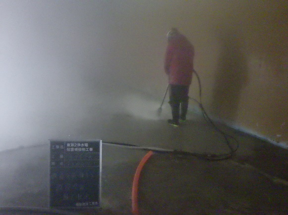 各池の内部に足場を組立ててから、超高圧洗浄により既設の塗膜の除去を行いました。