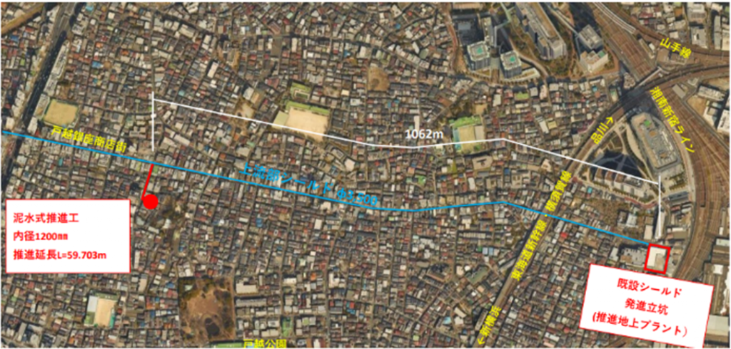 戸越銀座商店街の地下に既設シールドトンネル(内径3,600mm)からの直接発進を行う工事で、シールド発進立坑からおよそ1.1㎞が推進発進起点です。