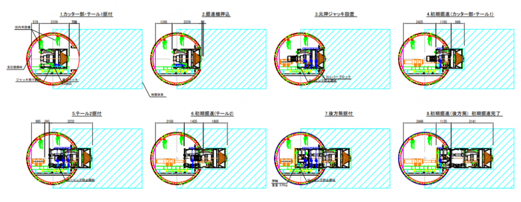 - 掘進機は、新たに第一修正と第二修正の間に分割面を設け、2,950㎜以内で初期掘進できる寸法にしました。