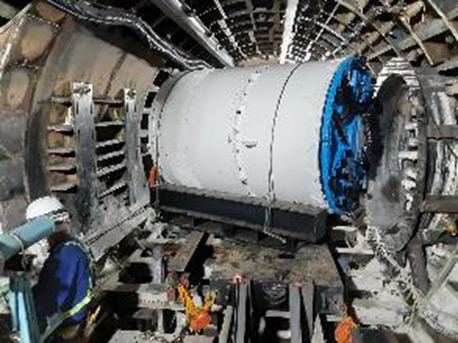 - 初期掘進の第一段階としてカッター部とテール1を接続しシールド坑内に運搬しなければいけませんが、推進方向に運搬すると既存の安全通路手摺に干渉するため、掘進機をシールド坑内に運搬後、推進法線に回転させる手順で行いました。